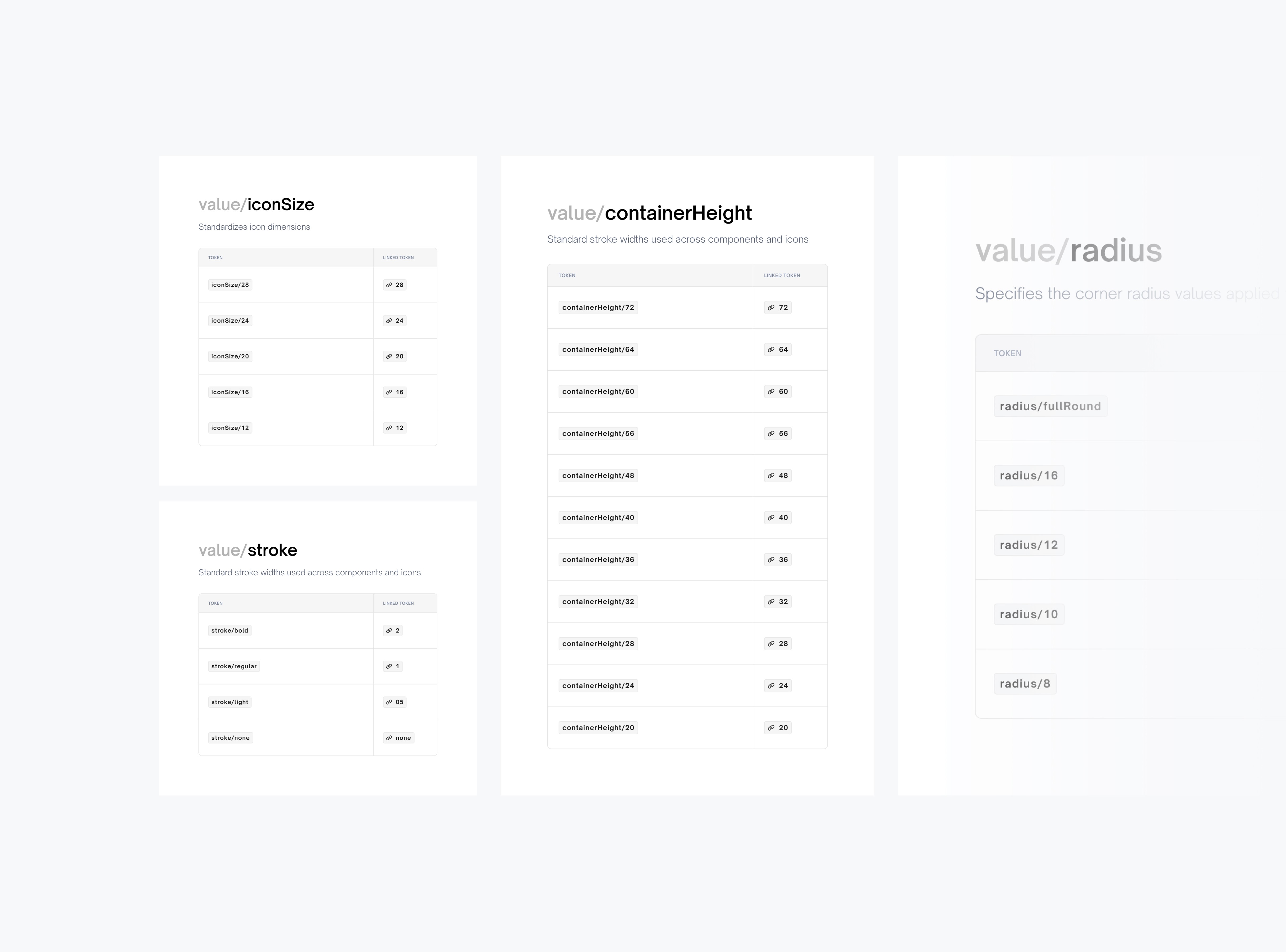 Cover dimensions like stroke widths, icon sizes, radii, and spacing units. They provide standardised measurements that can be reused across components.