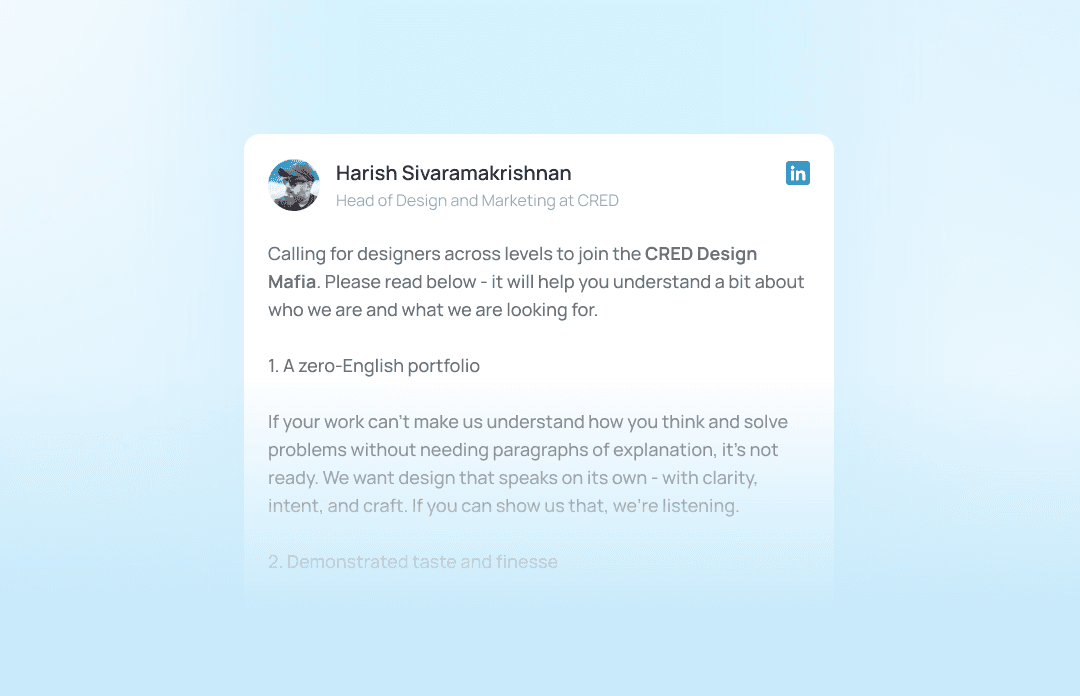 He had sent me a link to Anoop’s post on X about open design roles at CRED, and simply encouraged me to apply.